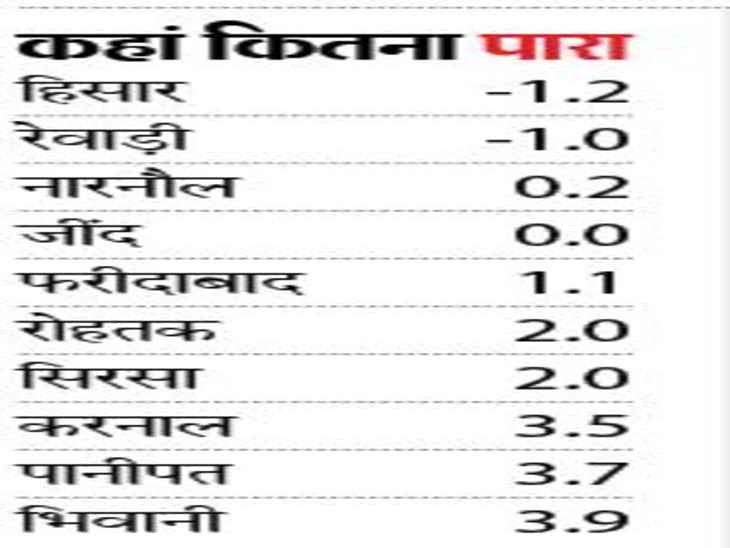 नए साल के पहले दिन हरियाणा में ठंड ने पिछले 6 साल का रिकॉर्ड तोड़ दिया। यहां न्यूनतम तापमान माइनस 1.2 डिग्री सेल्सियस रहा। यह सामान्य से 8 डिग्री कम है। इससे पहले 6 जनवरी 2014 को यहां न्यूनतम तापमान माइनस 2.1 डिग्री दर्ज किया गया था।